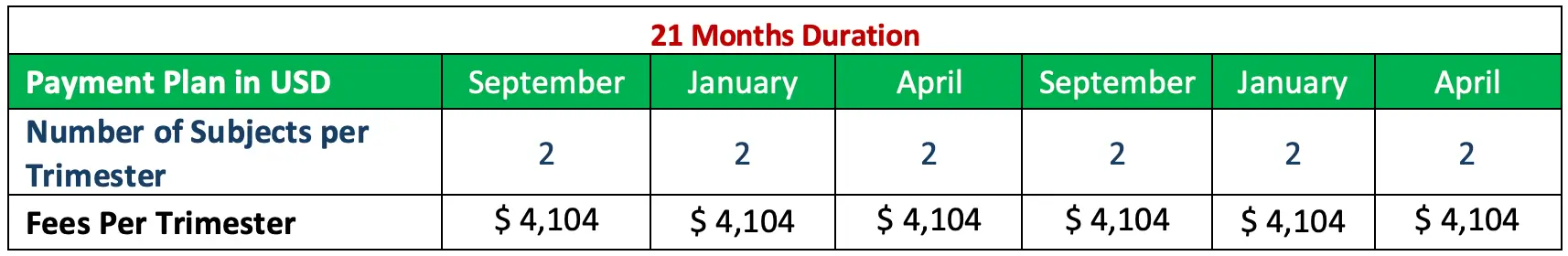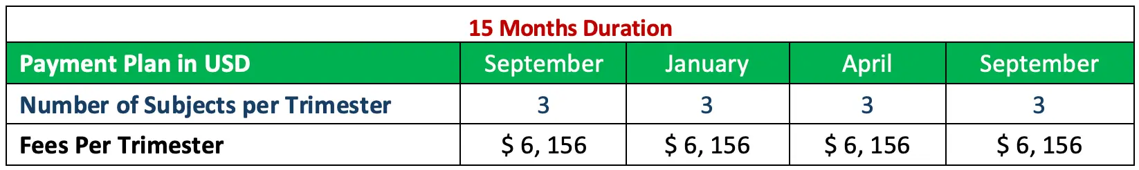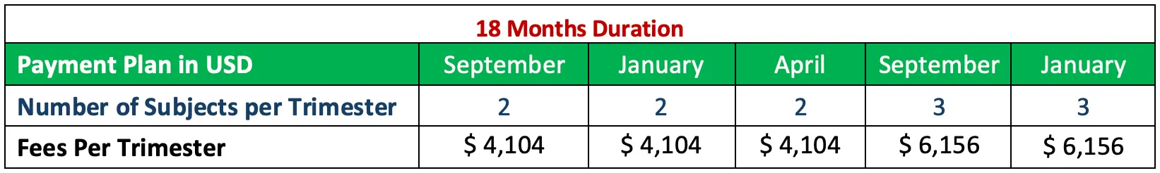 You can complete your Master’s degree in 15, 18 or 21 months depending on the number of subjects you choose to take per trimester as detailed in the below 3 tables: